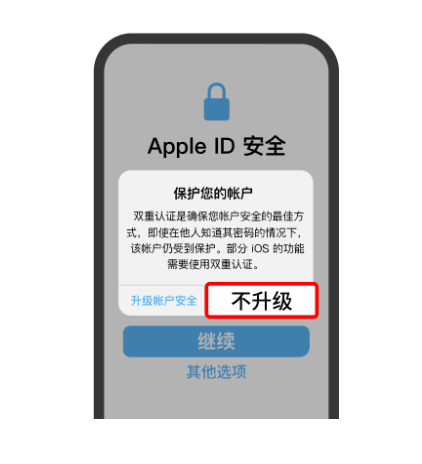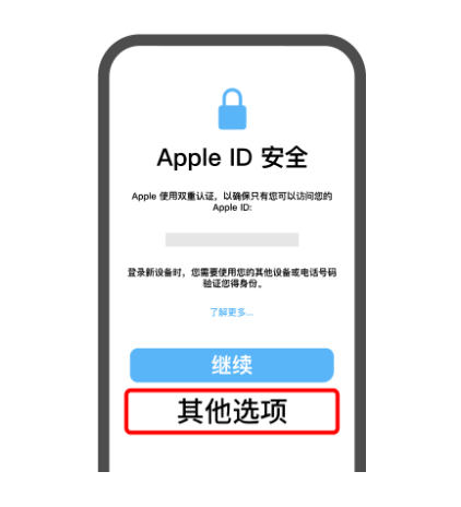 登录公开 Apple ID后,会弹出 Apple ID 安全页面,务必点击其他选项